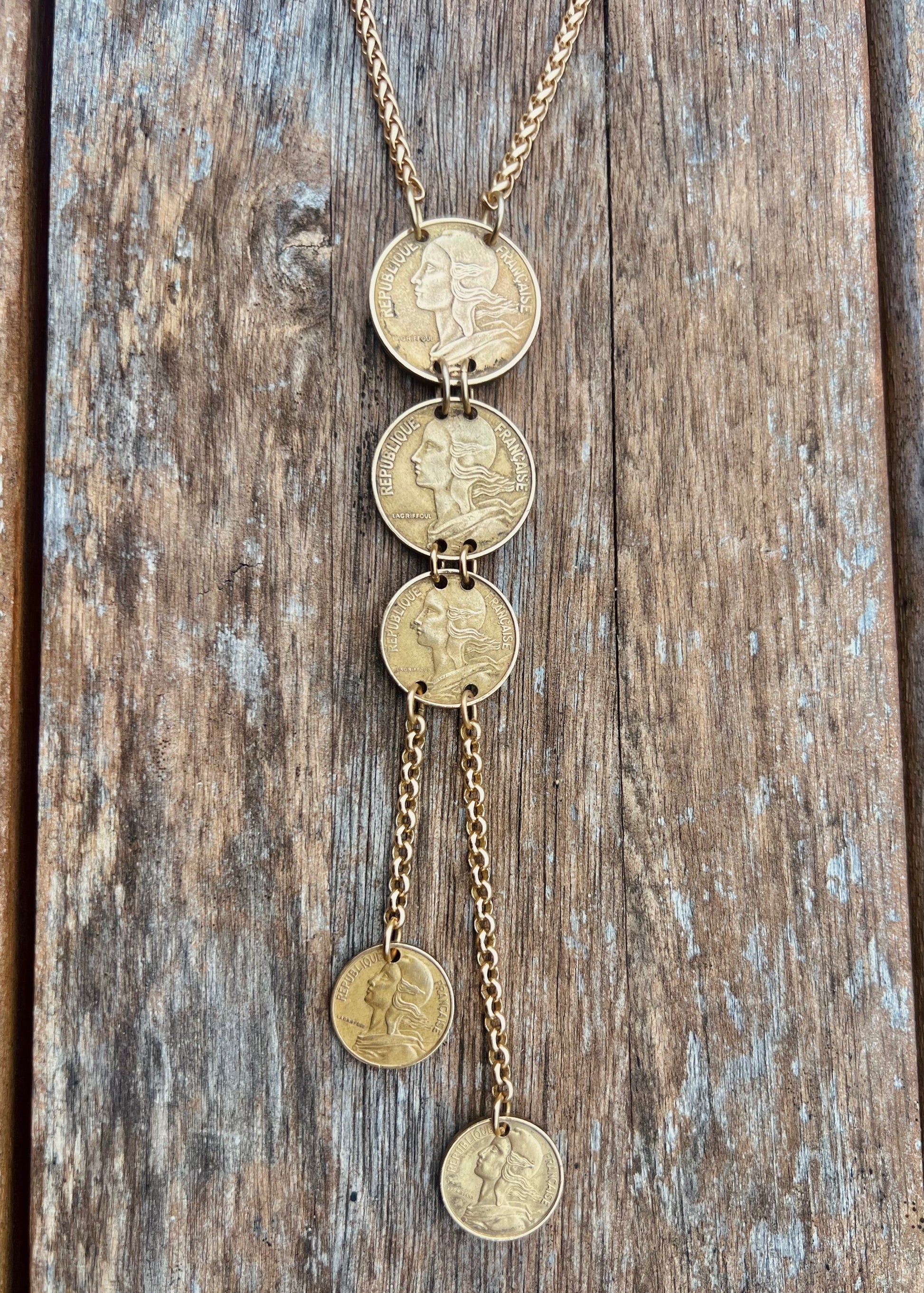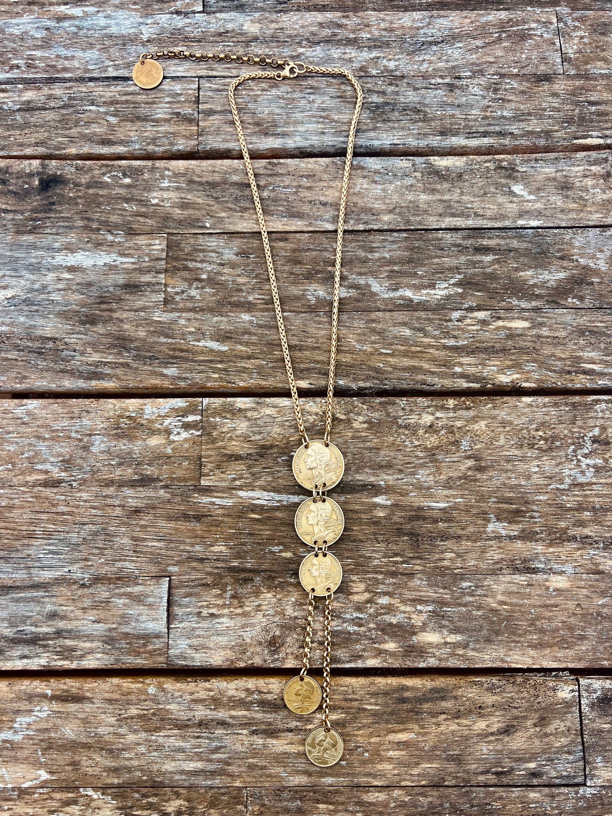 A statement piece perfect for an evening out on the town or to compliment your dance costume. Base metal chains and 6 vintage french coins were used to make this piece. Adjustable length from 21 inches to 25 inches.