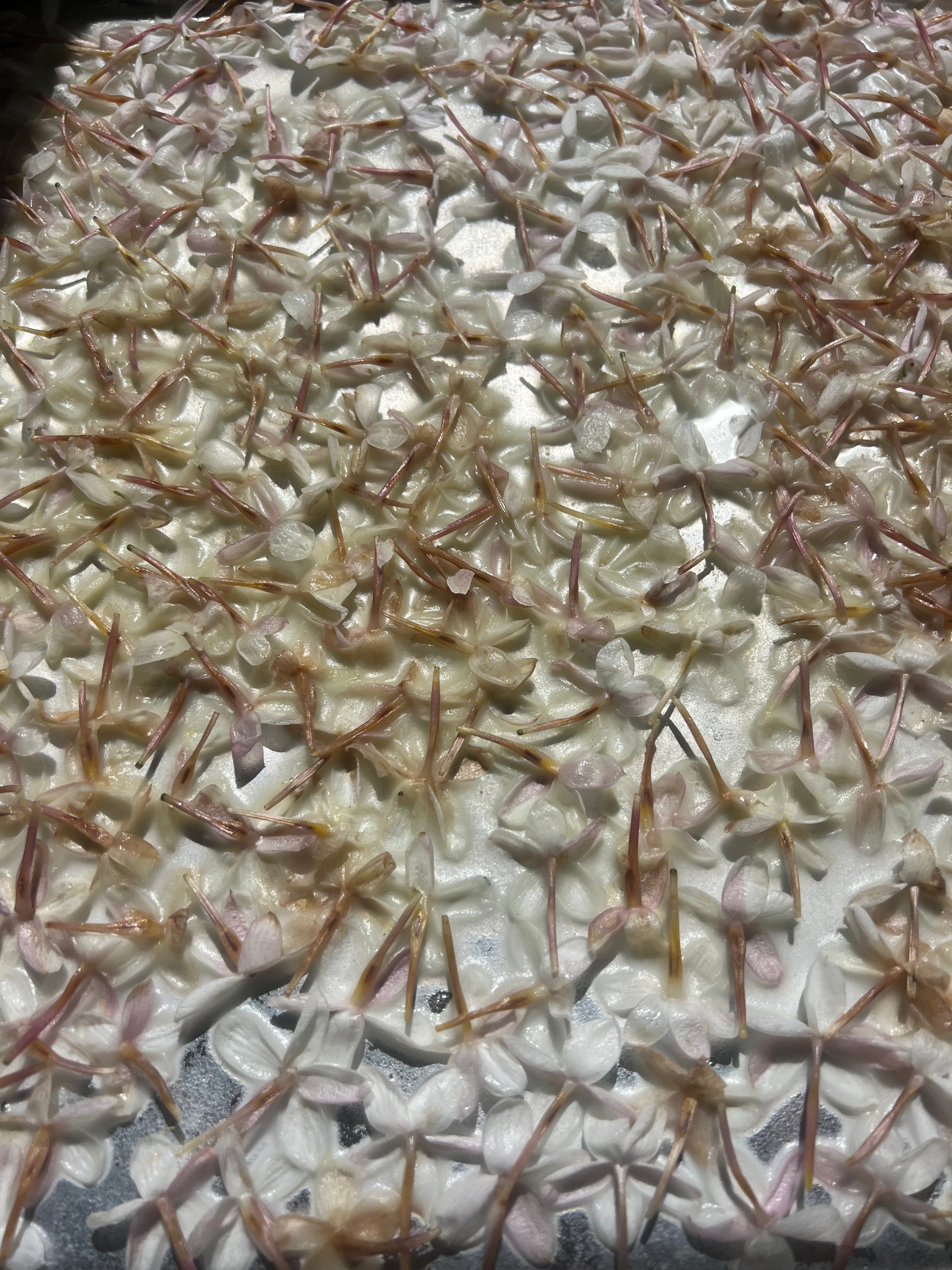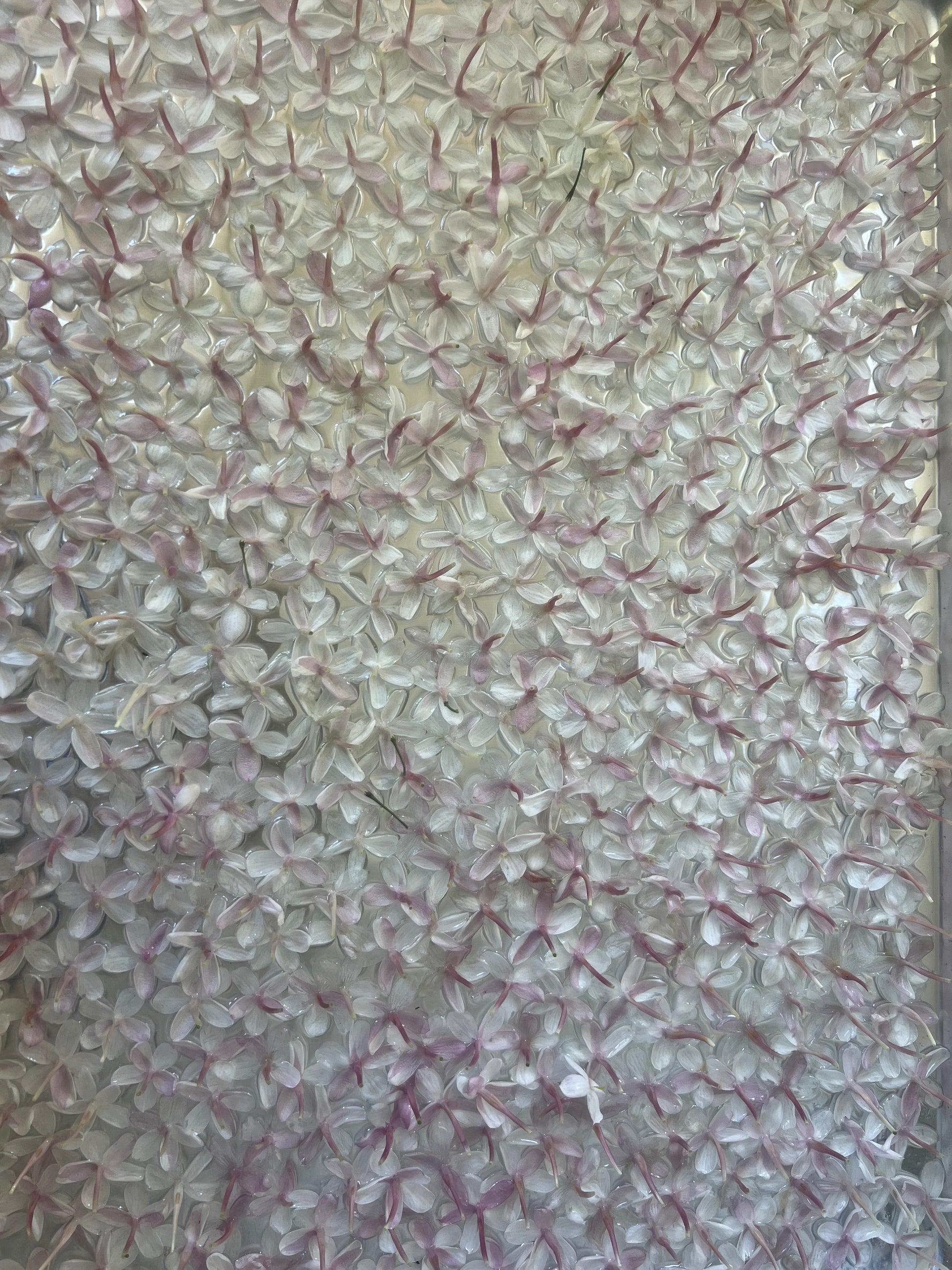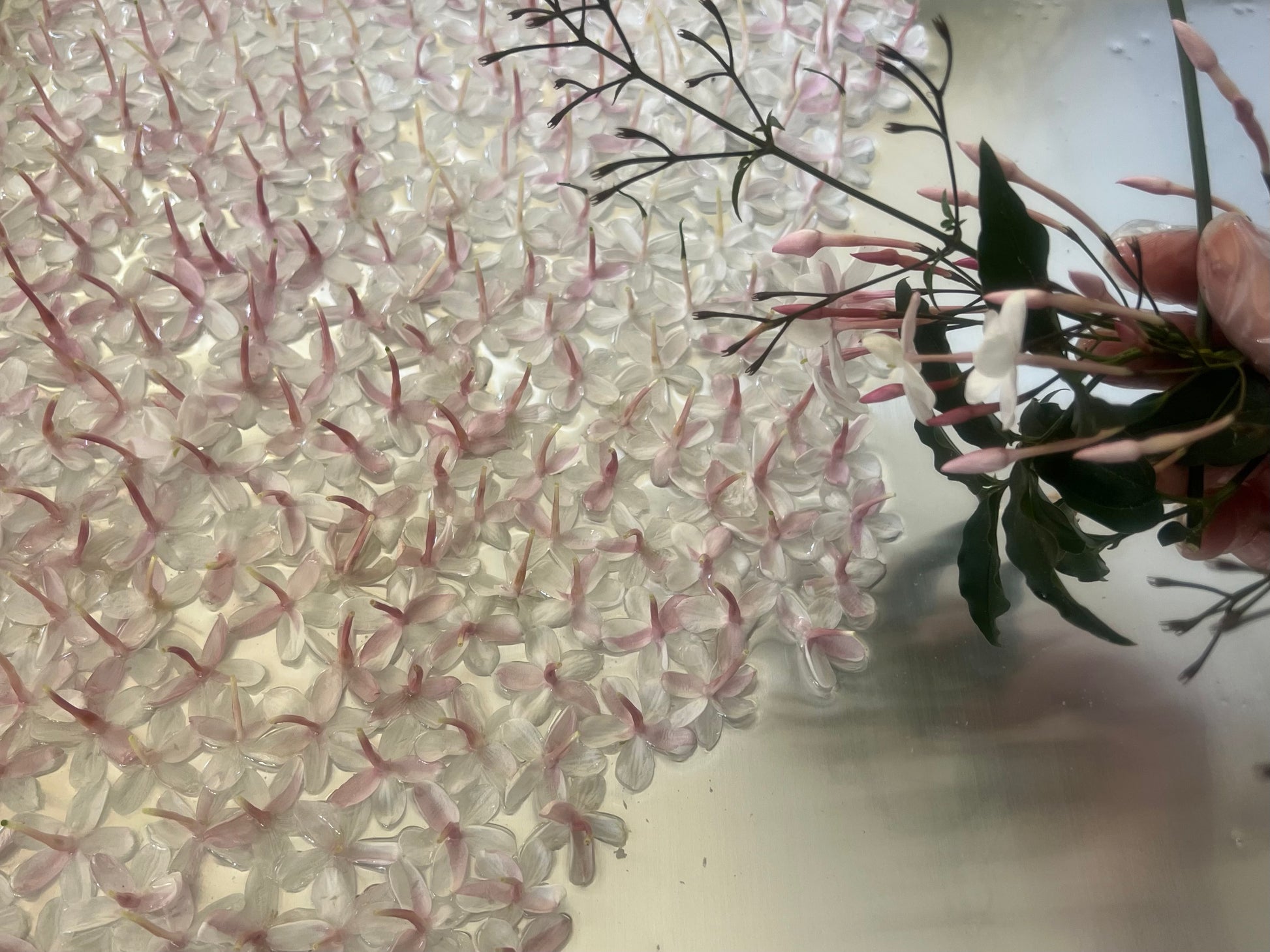 This is an especially precious creation—an enfleurage crafted entirely by hand using traditional, time-intensive methods. Enfleurage is one of the oldest techniques in perfumery: fresh blossoms are gathered at their peak and gently pressed into fat (traditionally animal fat is used but I used coconut oil) so their aroma can slowly infuse over time. Each batch requires repeated replenishing of petals as they wilt, allowing the fragrance to build layer by layer. The result is a true embodiment of the flower itself—soft, complex, and alive.